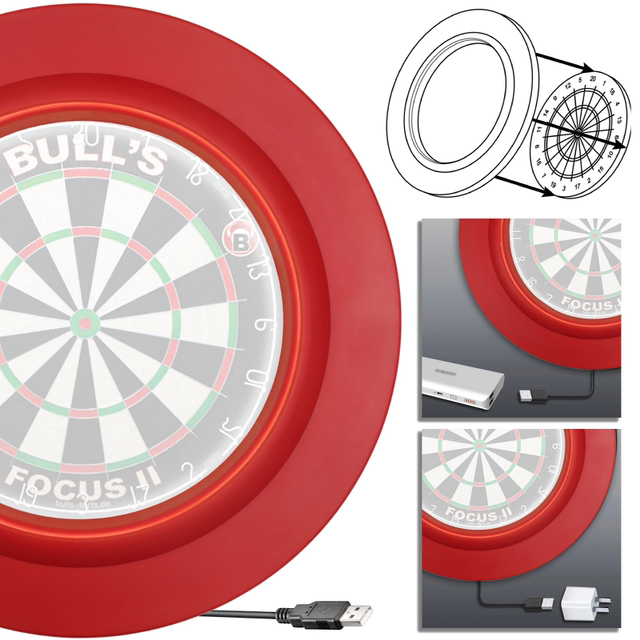 This modern LED PU Surround illuminates your dartboard optimally with its 180 LEDs. The lamps are cold white and mounted in such a way that the thrower is not blinded. The professional PU Surround has a thickness of approx. 3.5 cm. Due to this thickness, the player can decide for himself how far the surround is pushed onto the dartboard. The deeper the surround is stuck on the dartboard, the darker the playing surface of the board will be. Thus, every dart player can determine the optimal lighting of his board individually. The surround is equipped with a USB cable, which can be connected to a power supply 2.4 A or a power bank, both not included in the scope of delivery